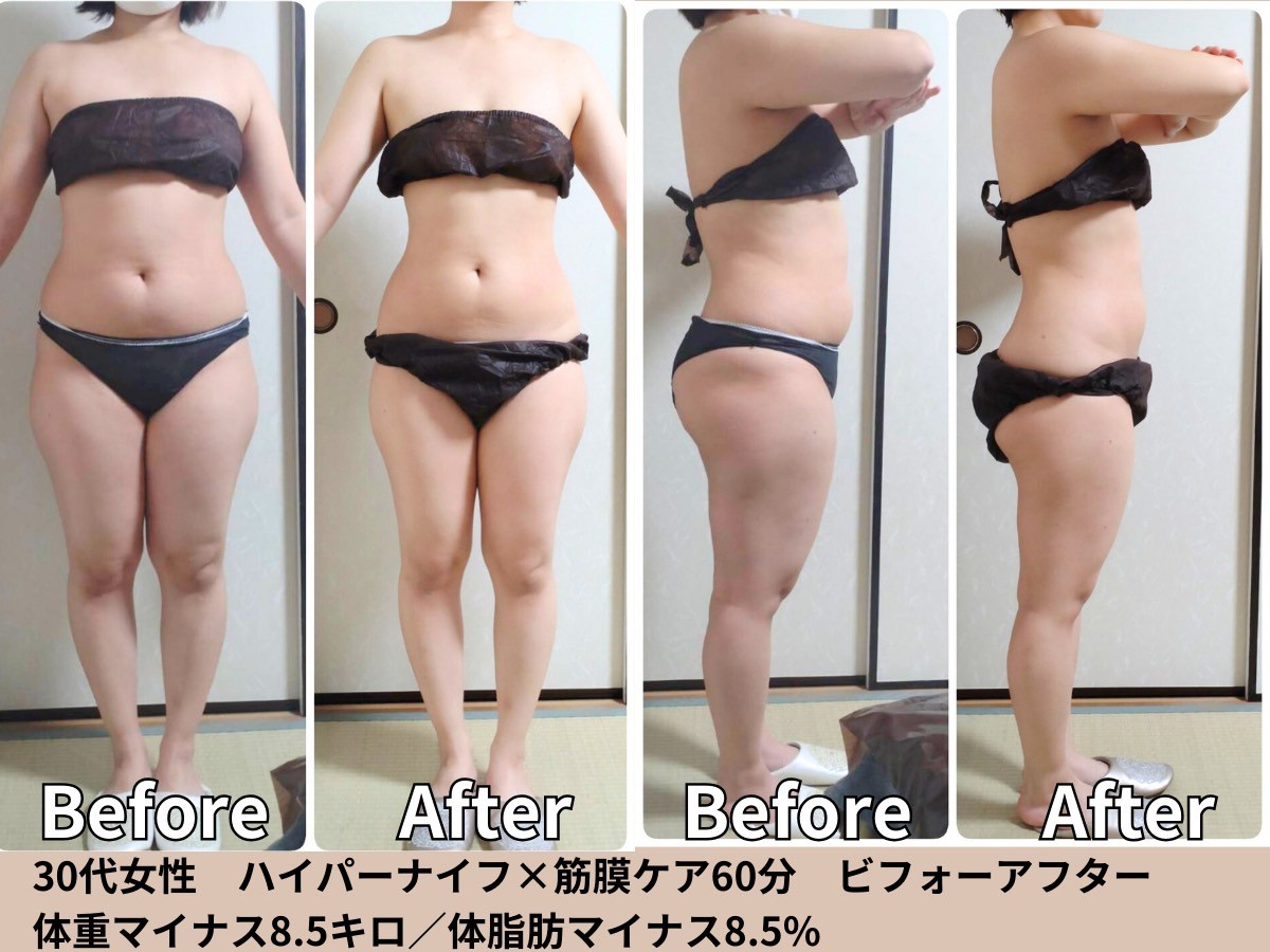 「ハイパーナイフで温めてもしっかり汗をかき、終わったあとのスッキリ感がやみつきに。冷えや腰の重だるさも軽減されました」 (30代女性)というように、脂肪だけでなく体の巡りの改善にもつながっています。